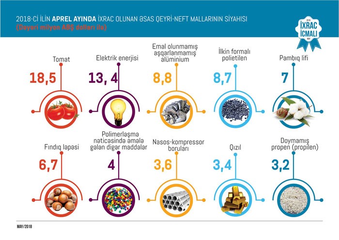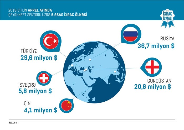 Dövlət Statistika Komitəsinin məlumatına əsasən cari ilin aprel ayında isə qeyri-neft sektoru üzrə ixrac 128,9 milyon ABŞ dolları təşkil edib. 2018-ci ilin aprel ayında ən çox qeyri-neft sektoruna aid mal ixrac edilən ölkələrin siyahısında ilk beşlikdə Rusiya (36,7 milyon ABŞ dolları), Türkiyə (29,6 milyon ABŞ dolları), Gürcüstan (20,6 milyon ABŞ dolları), İsveçrə (5,8 milyon ABŞ dolları) və Çin (4 milyon ABŞ dolları) qərarlaşıb. 2018-ci ilin aprel ayında qeyri-neft sektoru üzrə ixracda tomat (pomidor) birinci (18,5 milyon ABŞ dolları), elektrik enerjisi (13,4 milyon ABŞ dolları) ikinci, emal olunmamış aşqarlanmamış alüminium (8,8 milyon ABŞ dolları) isə üçüncü olub.