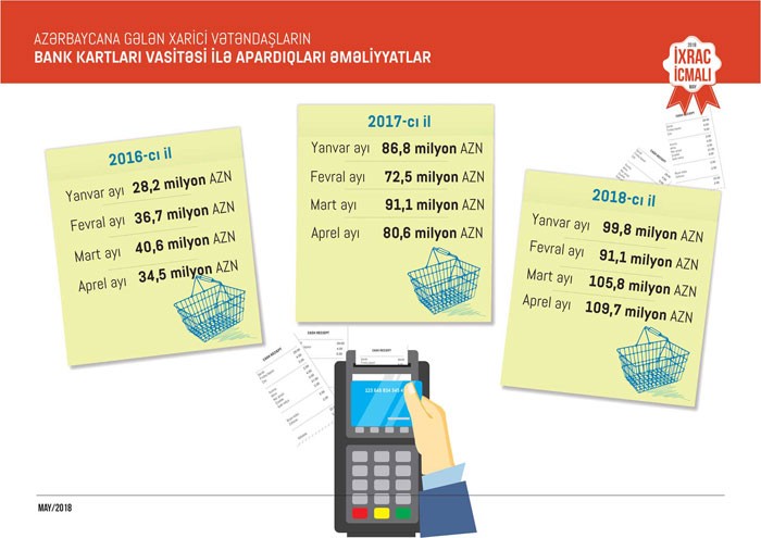 “İxrac İcmalı”nda məlumat verilib ki, 2018-ci ilin yanvar-aprel ayları ərzində Azərbaycana dünyanın 182 ölkəsindən 847,6 min və ya ötən ilin müvafiq dövrü ilə müqayisədə 13,4 faiz çox əcnəbi və vətəndaşlığı olmayan şəxs gəlib. 2018-ci ilin yanvar-aprel aylarında ölkəmizə gələn xarici vətəndaşların sayına paralel olaraq onların bank kartları vasitəsi ilə xərcləmələrində də artım müşahidə edilib. Belə ki, cari ilin aprel ayında ölkəmizə gələn xarici vətəndaşların bank kartları vasitəsi ilə apardıqları əməliyyatların 109,7 milyon manat təşkil etmiş və ötən ilin aprel ayı ilə müqayisədə 36 faiz artıb.