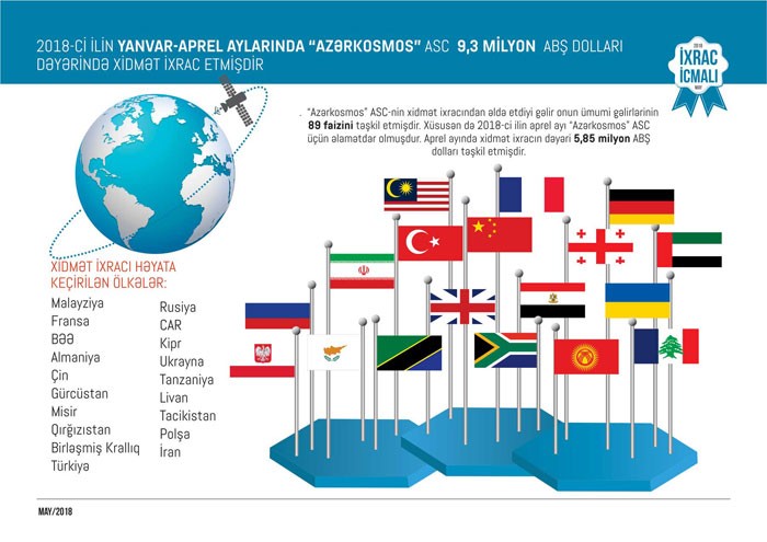 “İxrac İcmalı”ndə həm də xidmət ixracına yer ayrılıb. Göstərilib ki, 2018-ci ilin yanvar-aprel aylarında “Azərkosmos” ASC tərəfindən dünyanın 19 ölkəsinə peyk və telekommunikasiya xidmətləri ixrac edilib. Cari ilin ilk 4 ayında “Azərkosmos” ASC peyk və telekommunikasiya xidmətlərinin ixracından 9,3 milyon ABŞ dolları məbləğində gəlir əldə edib. “Azərkosmos” ASC-nin xidmət ixracından əldə etdiyi gəlir onun ümumi gəlirlərinin 89 faizini təşkil edib. Xüsusən də 2018-ci ilin aprel ayı “Azərkosmos” ASC üçün əlamətdar olub. Aprel ayında xidmət ixracın dəyəri 5,85 milyon ABŞ dolları təşkil edib.