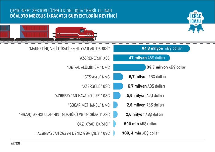 “İxrac İcmalı”nın aprel sayında qeyri-neft sektoru üzrə əsas ixracatçı şirkətlərin reytinqi verilib. 2018-ci ilin yanvar-aprel aylarında qeyri-neft sektoru üzrə qeyri-dövlət ixracatçı şirkətlərin siyahısında ilk onluqda “Azərbaycan İnterneyşnl Mayninq Kompani Limited Şirkəti”nin Azərbaycan Respublikasındakı nümayəndəliyi, "MKT İstehsalat Kommersiya" MMC, "Baku Steel Company" MMC, "Aqrodoctor" MMC, "Metalçılar-2" MMC, "Qala meyvə-tərəvəz ixracat idxalat" MMC, "Sun Food" MMC, "Ram Beynəlxalq Nəqliyyat və Ticarət LTD" MMC, "Azərbaycan Şəkər İstehsalat Birliyi" MMC və "Gilan tekstil park" MMC.