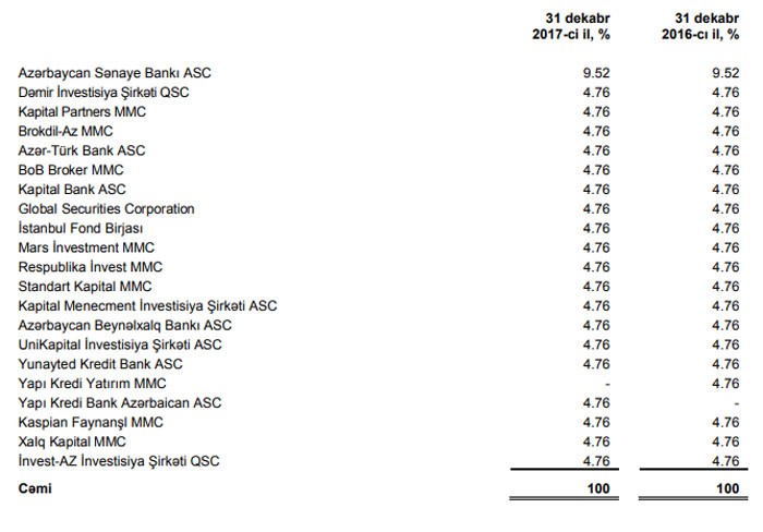"“Bakı Fond Birjası” QSC-nin 25 may 2018-ci il tarixində keçirilmiş Səhmdarlarının növbəti Ümumi Yığıncağında qəbul edilmiş qərara əsasən BFB-nin səhmdarlarına 2017-ci il üzrə xalis mənfəətdən hər bir adi adlı səhm üzrə 80 (səksən) manat olmaqla (bir səhmin nominal dəyərinin 40% məbləğində) dividendin ödənilməsi həyata keçirilmişdir",- Birjadan "Marja"ya bildirilib.