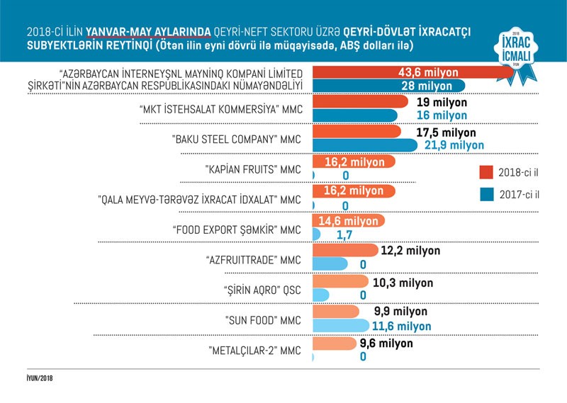 2018-ci ilin yanvar-may aylarında isə "Kapitan Fruits" MMC 16,2 milyon dollarlıq, "Qala meyvə-tərəvəz ixracat idxalat" MMC 16,2 milyon dollarlıq, ,“Azfruittrade” MMC 12,2 milyon dollarlıq, “Şirin Aqro” 10,3 milyon dollarlıq, "Metalçılar-2" isə 9,6 milyon dollarlıq mallar ixrac edib.