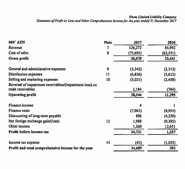 Həm satış artdığından, həm də xərclər azaldığından “Norm” MMC-nin əməliyyat mənfəəti artıb. 2016-cı ildə 11 milyon 295 min manat təşkil etmiş əməliyyat mənfəəti 2017-ci ildə 38 milyon 544 min manata yüksəlib. Digər maliyyə xərcləri çıxıldıqdan sonra 34 milyon 731 min manat mənfəət qalıb. MMC ötən il cəmi 42 min manat mənfəət vergisi ödəyib.