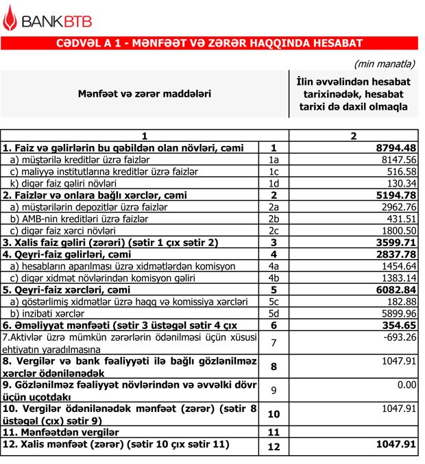 “Bank BTB”nin 11 milyon 632 min manat cəmi gəlirlərinə qarşı cəmi xərcləri 11 milyon 278 min manat təşkil edib. Nəticədə bankın 355 min manat əməliyyat mənfəəti yaranıb. Aktivlər üzrə mümkün zərərlərin ödənilməsi üçün yaradılmış ehtiyatların 693 min manatı azad olduğundan bank 1 milyon 48 min manat xalis mənfəət əldə edib. “Bank BTB” ilk 6 ayda mənfəət vergisi ödəməyib.