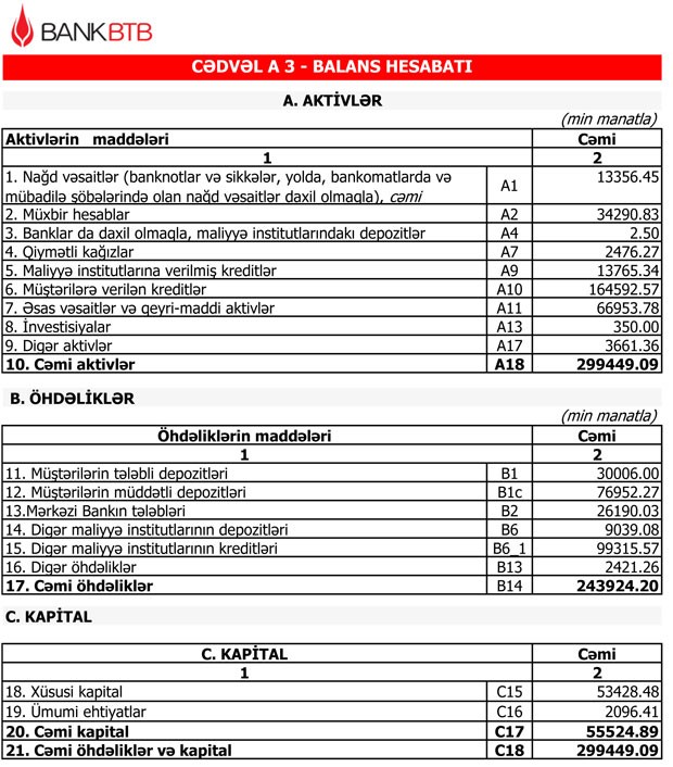 30 İyun 2018-ci il tarixində “Bank BTB”nin cəmi aktivləri 299 milyon 449 min manat, o cümlədən müştərilərə verilən kreditlər 164 milyon 592 min manat təşkil edib. 30 İyun 2017-ci il tarixində “Bank BTB”nin cəmi aktivləri 235 milyon 67 min manat, o cümlədən müştərilərə verilən kreditlər 115 milyon 128 min manat təşkil etmişdi. İllik müqayisədə kreditlər 43% artıb.