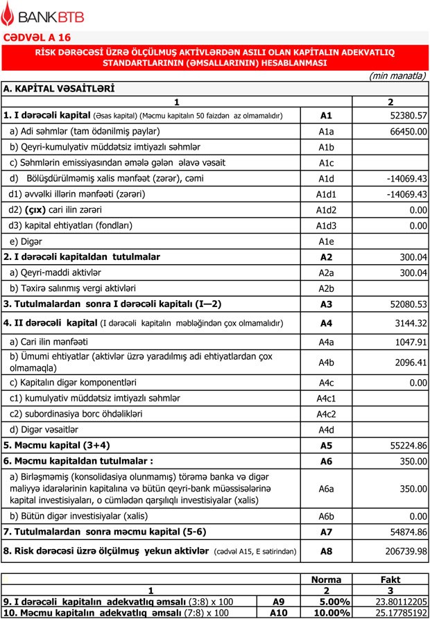 30 İyun 2018-ci il tarixində “Bank BTB” 54 milyon 875 min manat məcmu kapitala malik olub.