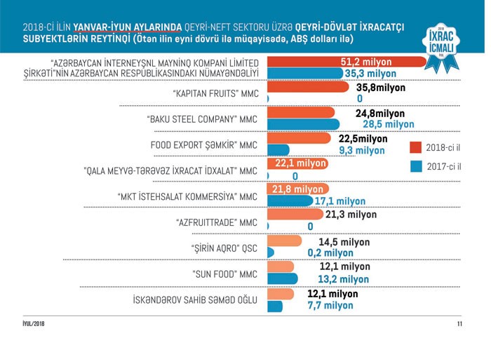 "Marja" xəbər verir ki, 2018-ci ilin yanvar-iyun aylarında qeyri-neft sektoru üzrə qeyri-dövlət ixracatçı şirkətlərin siyahısında ilk onluqda “Azərbaycan İnterneyşnl Mayninq Kompani Limited Şirkəti”nin Azərbaycandakı nümayəndəliyi, "Kapitan Fruits" MMC, "Baku Steel Company" MMC, “Food Export Şəmkir” MMC, "Qala meyvə-tərəvəz ixracat idxalat" MMC, "MKT İstehsalat Kommersiya" MMC, “Azfruittrade” MMC, “Şirin Aqro” QSC, "Sun Food" MMC, İskəndərov Sahib Səməd oğlu təmsil olunub.