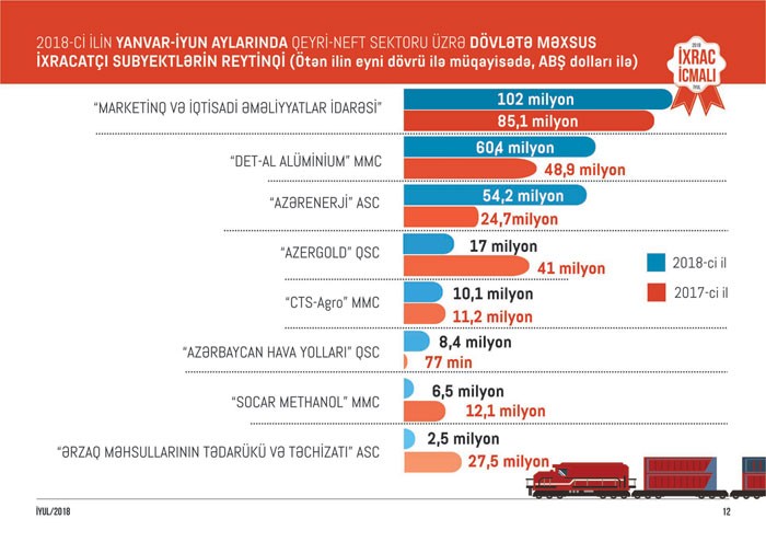 Qeyri-neft sektoru üzrə ixrac əməliyyatlarında iştirak edən dövlətə məxsus şirkətlərin siyahısında isə ARDNŞ-in “Marketinq və İqtisadi Əməliyyatlar İdarəsi” başçılıq edir. Daha sonra bu siyahıda aşağıdakı şirkətlərin adları var: "Det-al Alüminium" MMC, "Azərenerji" ATSC, "Azergold" QSC, “CTS-Agro” MMC, "Azərbaycan Hava Yolları" QSC, "SOCAR Methanol" MMC, "Ərzaq Məhsullarının Tədarükü və Təchizatı" ASC.