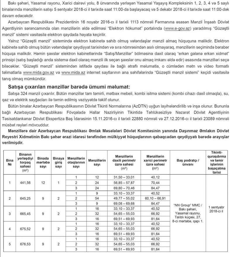 Mənzil İnşaatı Dövlət Agentliyinin ilk layihəsi olan Yasamal Yaşayış Kompleksindəki mənzillər təkrar satışa çıxarılıb. Xatırladaq ki, ilk satış texniki problemlərə görə baş tutmamışdı.