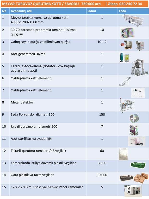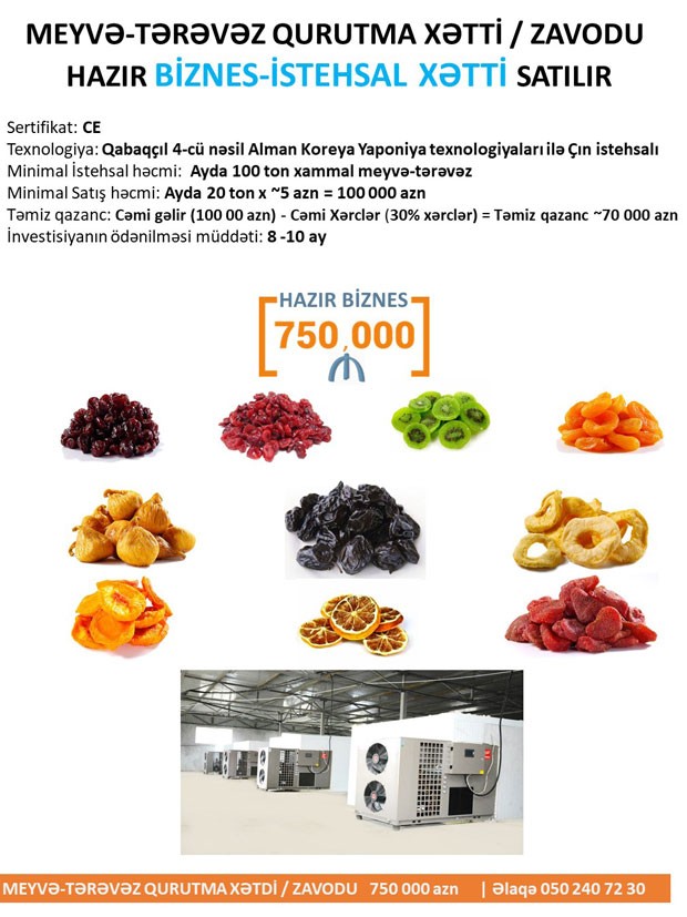 Müasir meyvə-tərəvəz qurutma istehsal xəttinin satışı ilə maraqlananlar 050 240 72 30 nömrəsi ilə əlaqə saxlaya bilərlər.