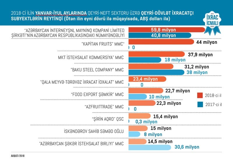 2018-ci ilin yanvar-iyul aylarında qeyri-neft sektoru üzrə qeyri-dövlət ixracatçı subyektlərin siyahısında ilk onluqda “Azərbaycan İnterneyşnl Mayninq Kompani Limited Şirkəti”nin Azərbaycan Respublikasındakı nümayəndəliyi, "Kapitan Fruits" MMC, "MKT İstehsalat Kommersiya" MMC, "Baku Steel Company" MMC, "Qala meyvə-tərəvəz ixracat idxalat" MMC, “Food Export Şəmkir” MMC, “Azfruittrade” MMC, “Şirin Aqro” QSC, İskəndərov Sahib Səməd oğlu, "Azərbaycan Şəkər İstehsalat Birliyi" MMC təmsil olunub.