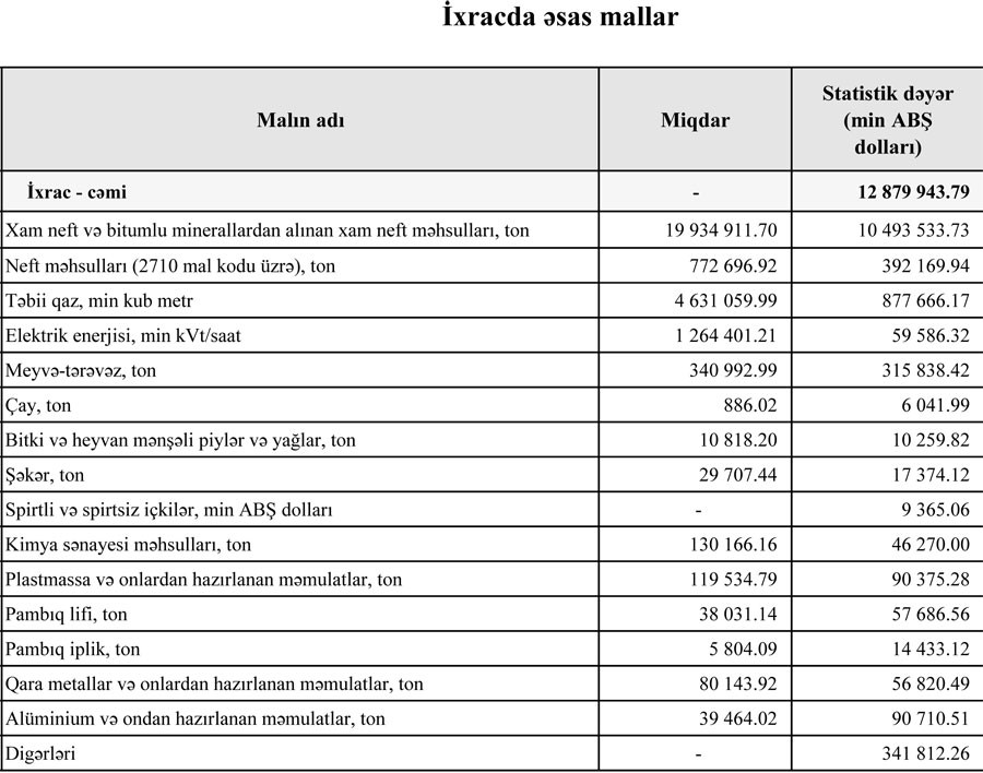 2018-ci ilin yanvar-avqust ayları ərzində Azərbaycanın 12 milyard 880 milyon dollarlıq ixracının 10 milyard 493 milyon dollarını və ya 81.47%-ni xam neft təşkil edib.