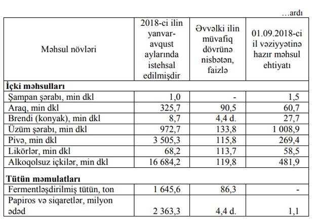 “Marja” Dövlət Statistika Komitəsinə istinadən xəbər verir ki, əvvəlki ilin yanvar-avqust ayları ilə müqayisədə tütün məmulatlarının istehsalında 2,6 dəfə, içki istehsalında 9,3 faiz artım, qida məhsullarının istehsalında isə 1,0 faiz azalma müşahidə olunmuşdur. Bu sahələrin əsas məhsullarından brendi (konyak) istehsalı 4,4 dəfə, üzüm şərabının istehsalı 33,8 faiz, alkoqolsuz içkilərin istehsalı 19,8 faiz artmış, bununla yanaşı cem və marmeladların istehsalı 0,7 faiz, kolbasa məmulatlarının istehsalı 1,4 faiz, duru bitki yağlarının istehsalı 8,1 faiz, qənd və şəkər tozu istehsalı 35,7 faiz azalmışdır.
