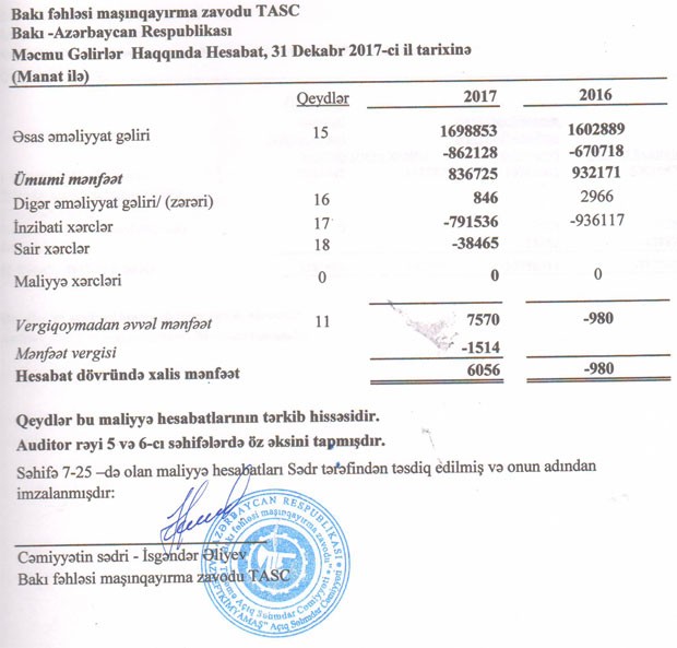 Digər tərəfdən, “Bakı Fəhləsi Maşınqayırma Törəmə zavodu” inzibati xərclərini azaltması hesabına xalis mənfəət əldə edib. 2016-cı ildə 936 min 117 manat təşkil etmiş inzibati xərclər 2017-ci ildə 791 min 536 manata düşüb. Ümumi mənfəət, sair xərclər daxil cəmi xərcləri üstələdiyindən ASC ötən ili 6 min 56 manat xalis mənfəələ başa vurub.