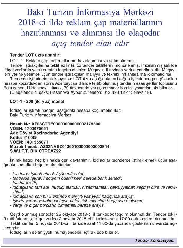 Bakı Turizm İnformasiya Mərkəzi 2018-ci ildə reklam çap materiallarının hazırlanması və alınması ilə əlaqədar açıq tender ealan edib.
