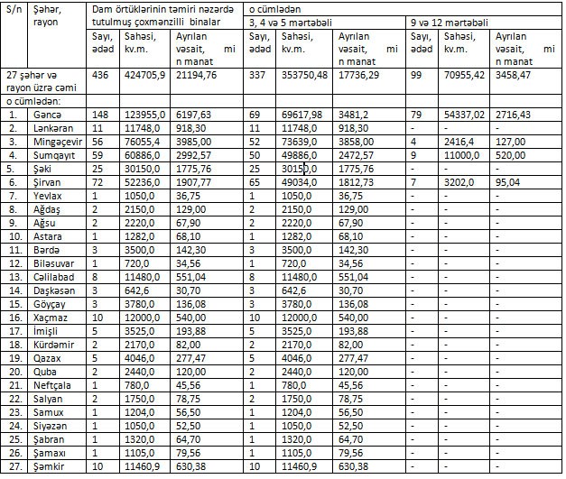 Dam örtüklərinin təmiri nəzərdə tutulmuş çoxmənzilli binaların şəhər və rayonlar üzrə bölgüsünə dair siyahı