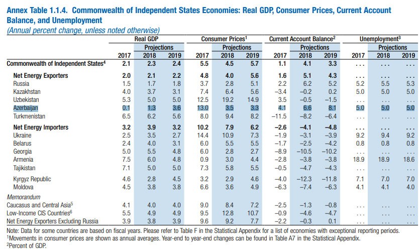 Müqayisə üçün qeyd edək ki, BVF, "Aprel 2018" hesabatında Azərbaycan iqtisadiyyatiyatının 2018-də 2%, 2019-cu ildə isə 3,9% artacağını proqnozlaşdırmışdı. Beləliklə, Azərbaycan iqtisadiyyatına dair iqtisadi artım proqnozları aşağı salınıb.