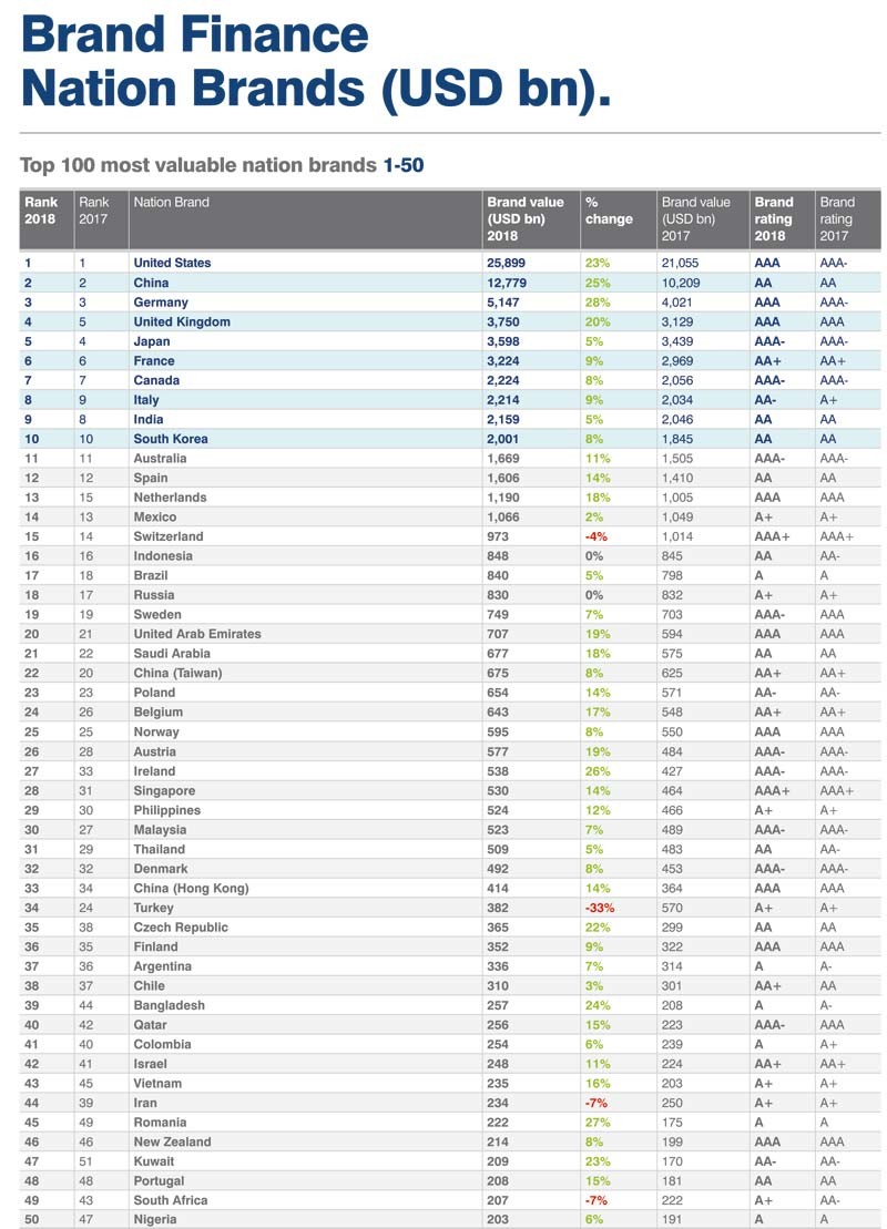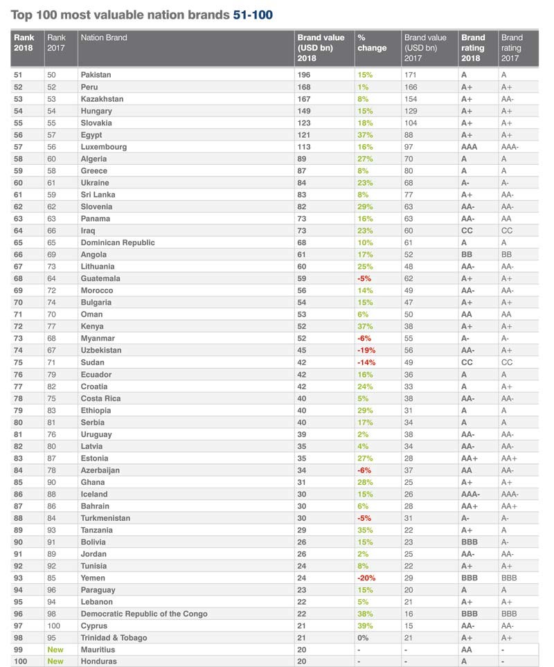 "Marja" xəbər verir ki, Azərbaycan dünyanın ən dəyərli milli brendə malik ölkələr siyahısında 84-cü yerdədir. 2017-ci ildə Azərbaycan 78-ci yerdə idi.