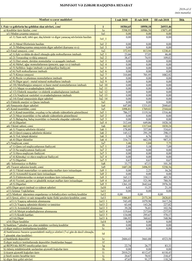 Ötən ilin yanvar-sentyabr dövründə kreditlər üzrə faizlər 14 milyon 713 min manat, banklarda depozitlərdən gəlir 1 milyon 422 min manat, ticarət qiymətli kağızları üzrə gəlir 1 milyon 391 min manat təşkil editmişdi.