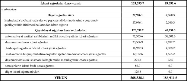 Maliyyə Bazarlarına Nəzarət Palatasından "Marja"ya daxil olmuş məlumata görə, könüllü sığorta bazarı üzrə haqlar 414.9 mln. manat, ödənişlər isə 137.3 mln. manat təşkil edib. İcbari sığorta bazarı üzrə haqlar 153.6 mln. manat, ödənişlər isə 49.6 mln. manat olub.