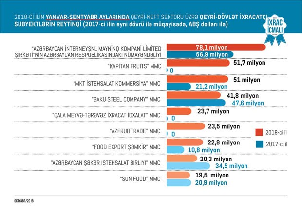 2018-ci ilin yanvar-sentyabr aylarında qeyri-neft sektoru üzrə qeyri-dövlət ixracatçı subyektlərin siyahısında “Azərbaycan İnterneyşnl Mayninq Kompani Limited Şirkəti”nin Azərbaycan Respublikasındakı nümayəndəliyi, "Kapitan Fruits" MMC, "MKT İstehsalat Kommersiya" MMC, "Baku Steel Company" MMC, "Qala meyvə-tərəvəz ixracat idxalat" MMC, “Azfruittrade” MMC, “Food Export Şəmkir” MMC, "Azərbaycan Şəkər İstehsalat Birliyi" MMC və “Sun Food” MMC önə çıxıb.