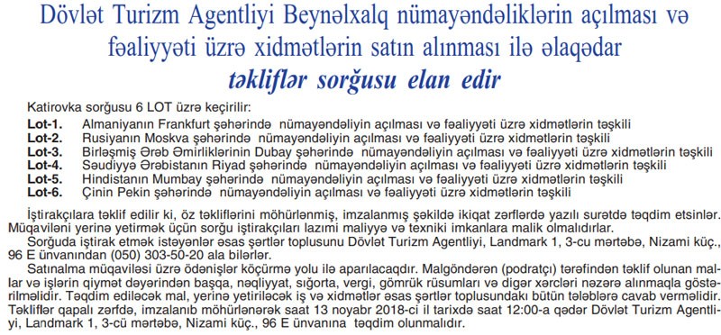 Dövlət Turizm Agentliyi Beynəlxalq nümayəndəliklərin açılması və fəaliyyəti üzrə xidmətlərin satın alınması ilə əlaqədar təkliflər soröusu elan edir.