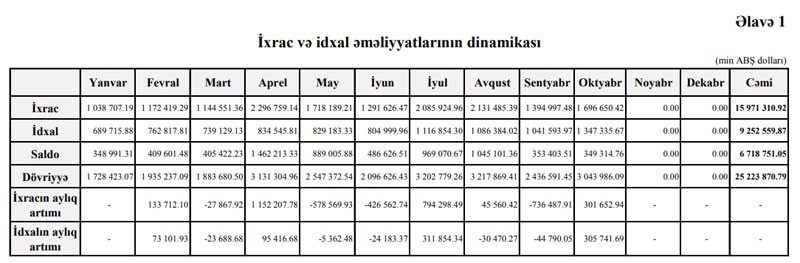 Oktyabrda ixrac 1 milyard 696 milyon 650 min dollar, idxal isə 1 milyard 347 milyon 335 min dollar olub. Oktyabrdakı idxal Azərbaycanın ən böyük aylıq idxalıdır. Bundan əvvəl ən böyük aylıq idxal 2018-ci ilin İyul ayında qeydə alınmışdı (1 milyard 116 milyon 854 min dollar)