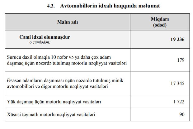 Ölkəyə gətirilən avtomobillərin 179 ədədi sürücü daxil olmaqla 10 nəfər və ya daha çox adam daşımaq üçün nəzərdə tutulmuş motorlu nəqliyyat vasitələri, 17 345 ədədi əsasən adamların daşınması üçün nəzərdə tutulmuş minik avtomobilləri və digər motorlu nəqliyyat vasitələri, 1 722 ədədi yük daşımaq üçün motorlu nəqliyyat vasitələri, 90 ədədi isə xüsusi təyinatlı motorlu nəqliyyat vasitələridir.