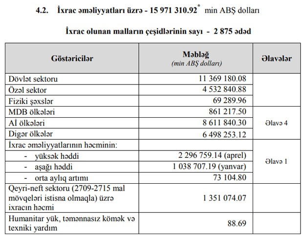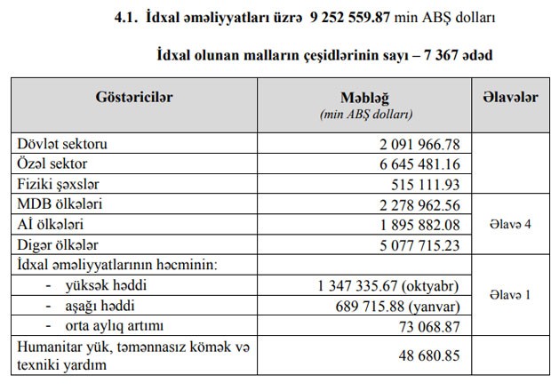 Qeyd edək ki, özəl sektorun idxalda payı daha böyükdür. Cari ilin 10 ayı ərzində Azərbaycanın 9 milyard 252 milyon dollarlıq idxalının 6 milyard 645 milyon dolları özəl, 2 milyard 91 milyon dolları dövlət sektoru və 515 min dolları fiziki şəxslər tərəfindən həyata keçirilib. Həmin dövrdə, 15 milyard 971 milyon dollarlıq ixracın 11 milyard 369 milyon dolları dövlət, 4 milyard 533 milyon dolları özəl, 69 min dolları özəl sektor tərəfindən həyata keçirilib.