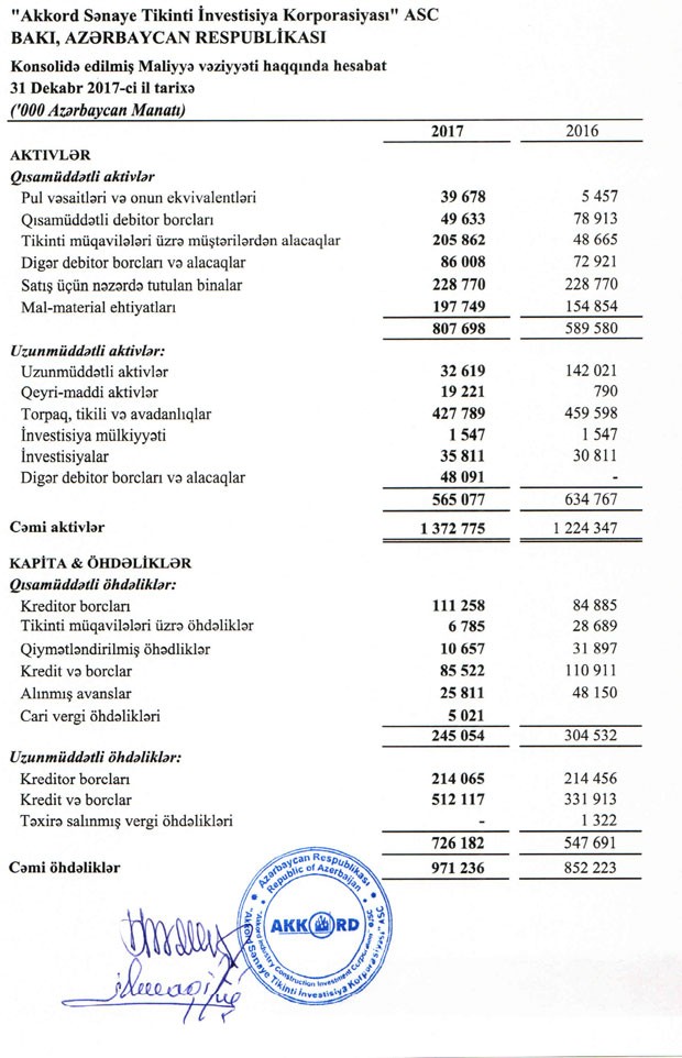 31 Dekabr 2017-ci il tarixində “Akkord Sənaye Tikinti Korporasiyası” 1 milyard 373 milyon manat cəmi aktivlərə malik olub. Şirkət 2016-cı ilin sonunda 1 milyard 224 milyon manat cəmi aktivlərə malik idi.