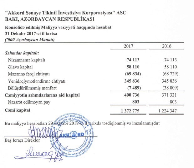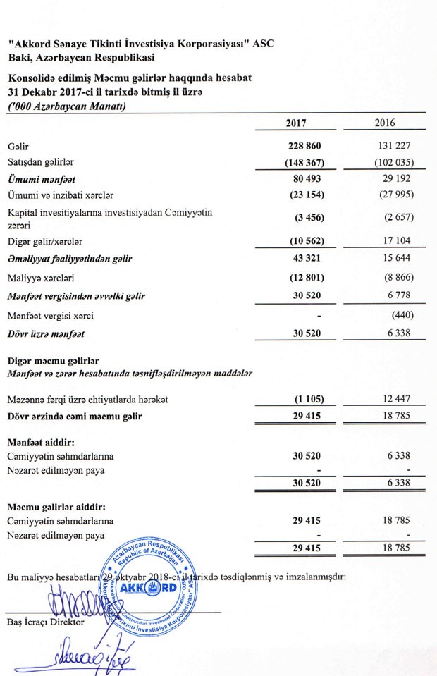 “Akkord Sənaye Tikinti Korporasiyası” ASC 2017-ci ilin 30 milyon 520 min manat xalis mənfəət ilə başa vurub. Müqayisə üçün qeyd edək ki, ASC 2016-cı ili 6 milyon 338 min manat xalis mənfəətlə bağlamışdı. Beləliklə, şirkətin xalis mənfəəti 5 dəfəyə yaxın artıb.