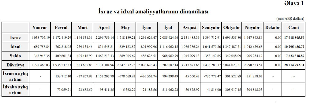 Noyabrda ixrac 1 milyard 947 milyon 894 min dollar, idxal isə 1 milyard 42 milyon 639 min dollar təşkil edib. Oktyabrda ixrac 1 milyard 696 milyon 535 min dollar, idxal isə 1 milyard 347 milyon 487 min dollar təşkil etmişdi.
