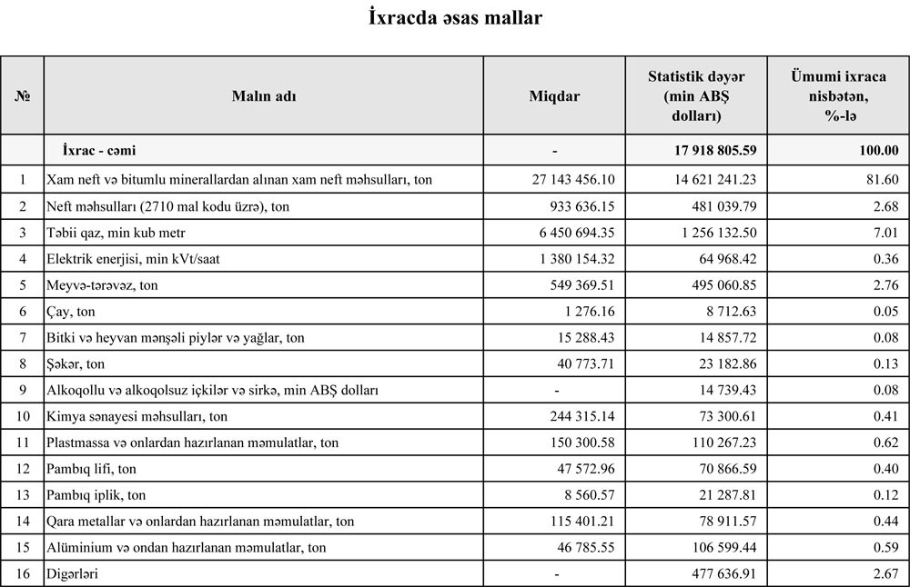 2018-ci ilin 11 ayı ərzində 14 milyard 621 milyon 241 min dollarlıq xam neft, 1 milyard 256 milyon 132 min dollarlıq təbii qaz ixrac olunub. Neft və qaz ixracın 87.7%-ni formalaşdırıb.