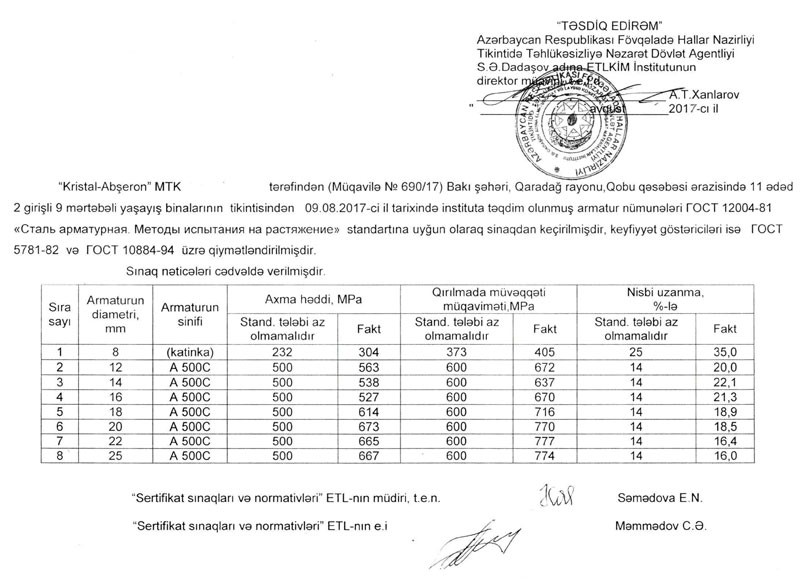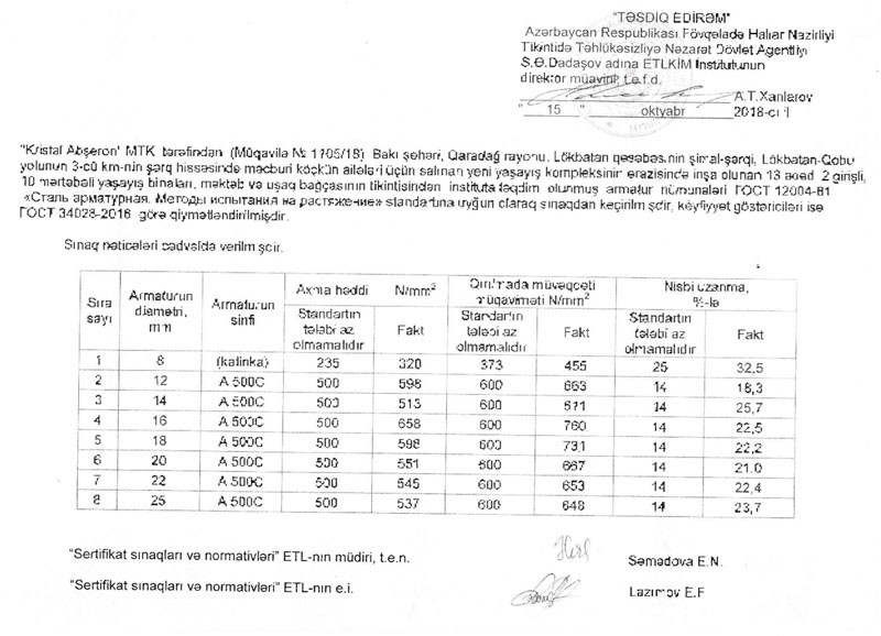 S.Ə.Dadaşov adına Elmi-Tədqiqat və Layihə-Konstruktor İnşaat Materialları İnstitutunun laboratoriyanın təqdim etdiyi nəticələrə tərəfimizdən baxış keçirildi, məlum oldu ki qeyd edilən layihələrdə istifadə edilən armatur materialları tələb edilən qayda və normalara tam uyğundur, inşaat zamanı heç bir əlavə ölkənin və ya sexlərin keyfiyyətsiz və tələblərə cavab verməyən materiallarından istifadə edilməmişdir.