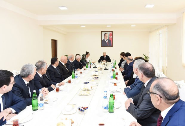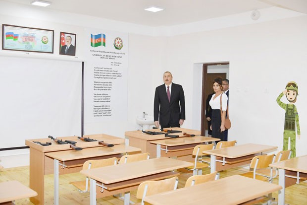 Məktəblə tanışlıqdan sonra Prezident İlham Əliyev və birinci xanım Mehriban Əliyeva məcburi köçkünlərlə görüşüblər.