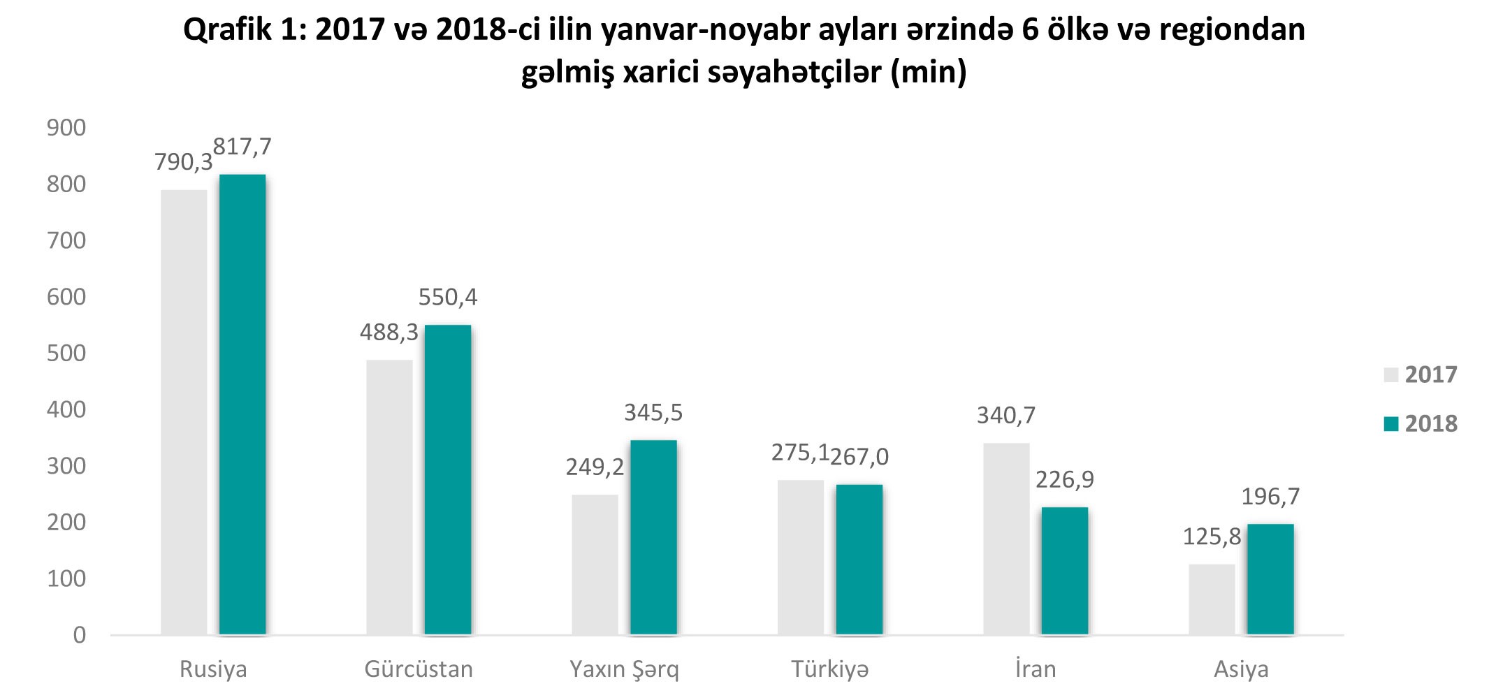 Rusiya, Gürcüstan və Yaxın Şərqdən gələn səyahətçilərin sayı 2018-ci ilin müvafiq müddətində Azərbaycana gəlmiş səyahətçilərin ümumi sayının 65%-ni təşkil edir. Bununla belə, qeyd edilmiş 6 ölkə və regionun bazar payında bəzi dəyişikliklər baş verib. Belə ki, İran 2017-ci ilin eyni dövrü ilə müqayisədə bazar payının təqribən 5%-ni, Rusiya və Türkiyə isə sadəcə 1%-ni itirib. Yaxın Şərq, Asiya və Gürcüstanın bazar payı isə əksinə müvafiq olaraq 3%, 2% və 1% artıb.