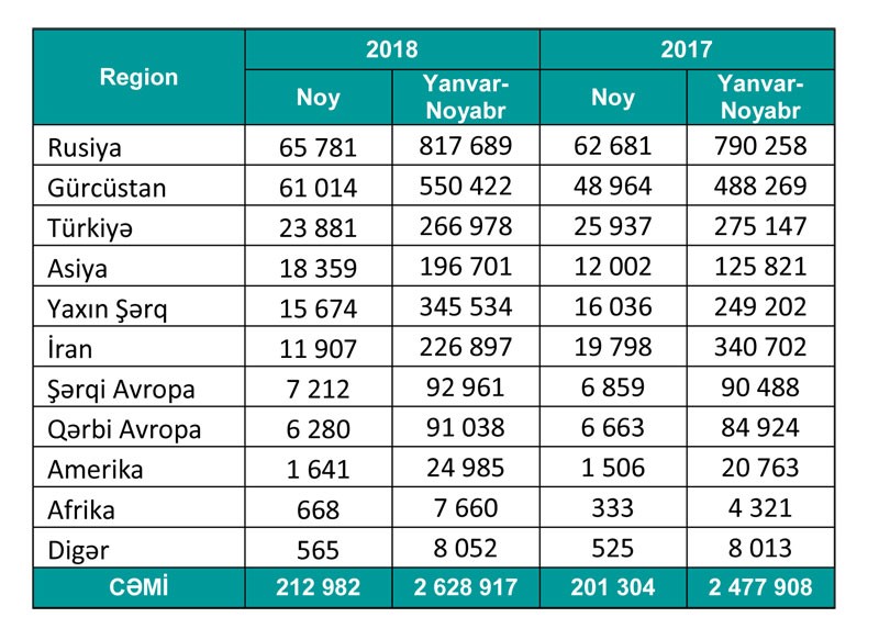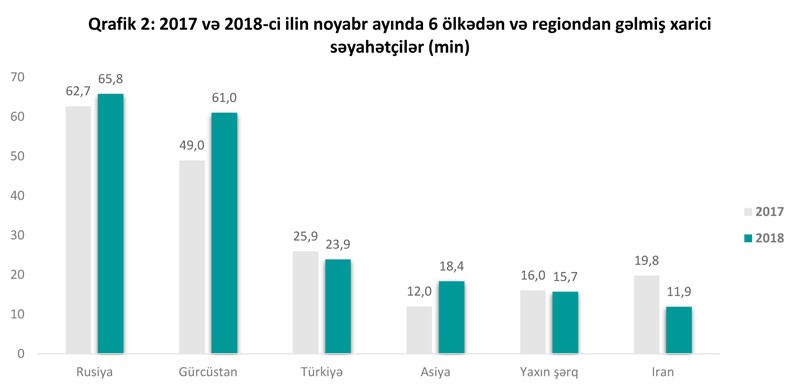 Noyabr ayında ölkəmizə səfər edənlərin sayı 2017-ci illə müqayisədə 6% artaraq 213 min nəfərə çatıb. Əhəmiyyətli artım Gürcüstandan (25%) və cəmi 18 min nəfər təşkil etməsinə baxmayaraq, Asiya ölkələrindən (53%) gələnlərin sayında müşahidə olunub (bax Qrafik 2). İl boyu olduğu kimi noyabr ayında da İrandan gələnlərin sayında kəskin azalma (40%) baş verib.