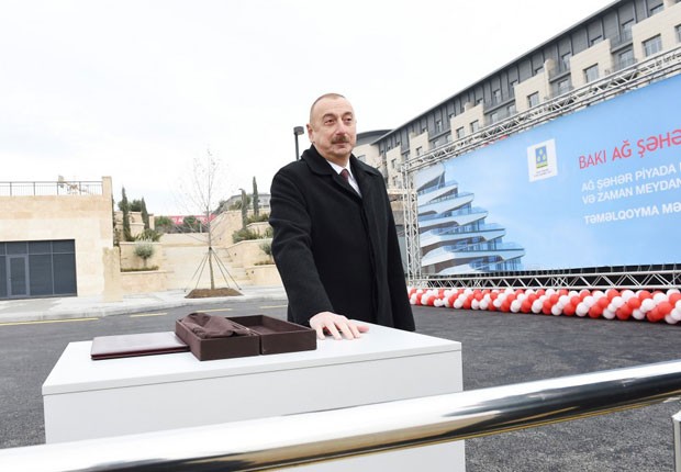 Daha sonra Prezident İlham Əliyev və birinci xanım Mehriban Əliyeva Ağ Şəhər piyada körpüsünün və Zaman meydanının təməlini qoyublar.