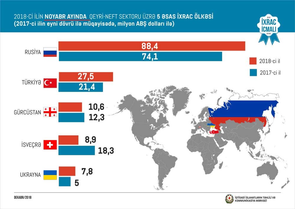 2018-ci ilin noyabr ayında isə qeyri-neft sektoru üzrə ixrac 181 milyon ABŞ dolları təşkil edib. 2018-ci ilin noyabr ayında qeyri-neft sektoruna aid ən çox mal ixrac edilən ölkələrin siyahısına Rusiya (88,4 milyon ABŞ dolları) başçılıq edib. Daha sonra bu siyahıda Türkiyənin (27,5 milyon ABŞ dolları), Gürcüstanın (10,6 milyon ABŞ dolları), İsveçrənin (8,9 milyon ABŞ dolları), Ukraynanın (7,8 milyon ABŞ dolları) və digər ölkələrin adları var.