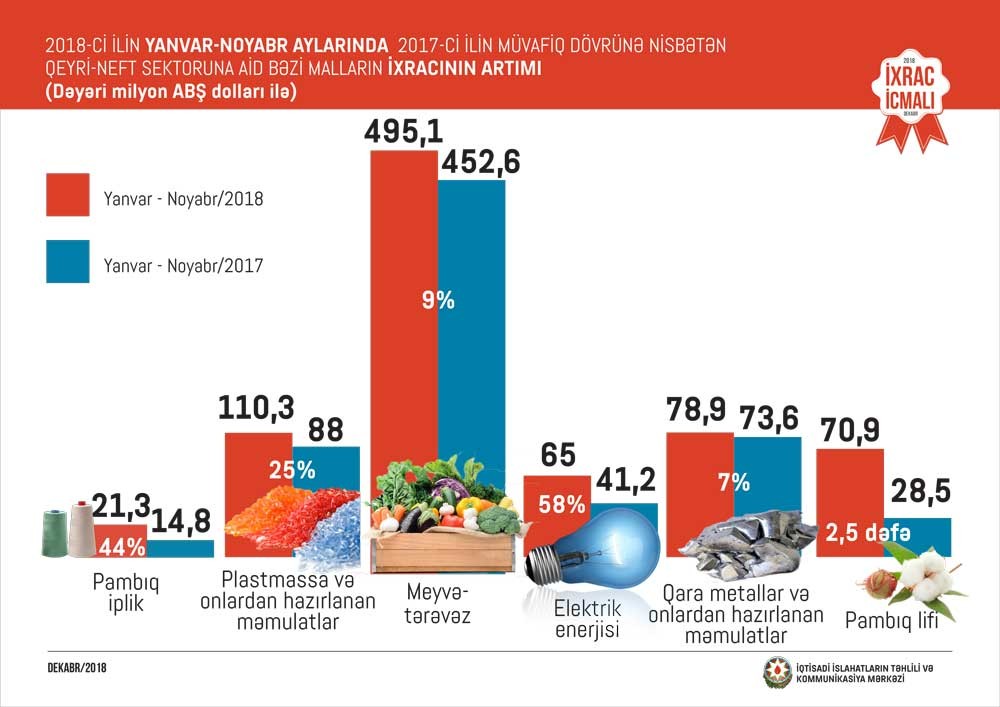 Ümumiyyətlə 2018-ci ilin yanvar-noyabr ayları ərzində meyvə-tərəvəz ixracı 495 milyon, plastmassa və onlardan hazırlanan məmulatların ixracı 110,3 milyon, alüminium və ondan hazırlanan məmulatların ixracı 106,6 milyon, elektrik enerjisinin ixracı 65 milyon, qara metallar və onlardan hazırlanan məmulatların ixracı 78,9 milyon, pambıq lifi ixracı 70,9 milyon, kimya sənayesi məhsullarının ixracı 73,3 milyon, pambıq ipliyi ixracı 21,3 milyon ABŞ dolları təşkil edib. 2017-ci ilin müvafiq dövrü ilə müqayisədə 2018-ci ilin 11 ayında pambıq lifinin ixracı 2,5 dəfə, elektrik enerjisinin ixracı 58 faiz, pambıq ipliyinin ixracı 44 faiz, plastmassa və onlardan hazırlanan məmulatların ixracı 25 faiz, meyvə-tərəvəzin ixracı 9 faiz, qara metallar və onlardan hazırlanan məmulatların ixracı 7 faiz, kimya sənayesi məhsulları 1 faiz artıb.