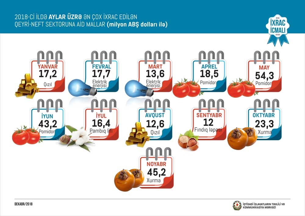 2018-ci ilin yanvar-noyabr ayları ərzində ixrac edilən qeyri-neft sektoruna aid malların siyahısında pomidor (162,2 milyon ABŞ dolları) birinci, qızıl (sikkə kəsilməsində istifadə olunmayan, digər emal olunmamış formalarda – 107,2 milyon ABŞ dolları) ikinci olub. Xurma isə (89,1 milyon ABŞ dolları) bu siyahıda üçüncü yerdə qərarlaşıb.