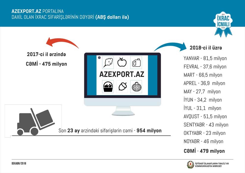 Göstərilib ki, 2018-ci ilin yanvar-noyabr aylarına Azexport.az portalına 479 milyon ABŞ dolları dəyərində ixrac sifarişləri daxil olub. 2017-ci ilin müvafiq dövrü ilə müqayisədə 2018-ci ilin yanvar-noyabr aylarında Azexport.az portalına daxil olan ixrac sifarişləri dəyər baxımından 8 faiz artıb. Bu ilin noyabr ayı ərzində isə Azexport.az portalına daxil olan sifarişlərin dəyəri 46 milyon ABŞ dolları təşkil edib.