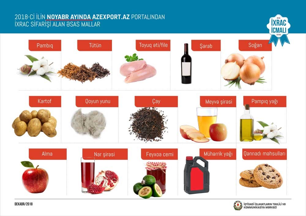 Daxil olan sifarişləri məhsullar üzrə təhlil etdikdə məlum olub ki, bu ilin noyabr ayında ən çox ixrac sifarişi xiyar, pomidor, soğan, yerkökü, fındıq, pambıq, pampıq yağı, bal, şərab, tütün, nar şirəsi, göbələk, nar, kartof, yun, çay, ipək xalça, konservləşdirilmiş tərəvəzlər, mühərrik yağı, kərə yağı, tikinti materialları, mebel dəsti, metal məhsullar, şokoladlı yağ, zəfəran, meyvə şirəsi, xurma qurusu, kələm, feyxoa cemi, tibbi tənzif, mineral su və s. mallara daxil olub.