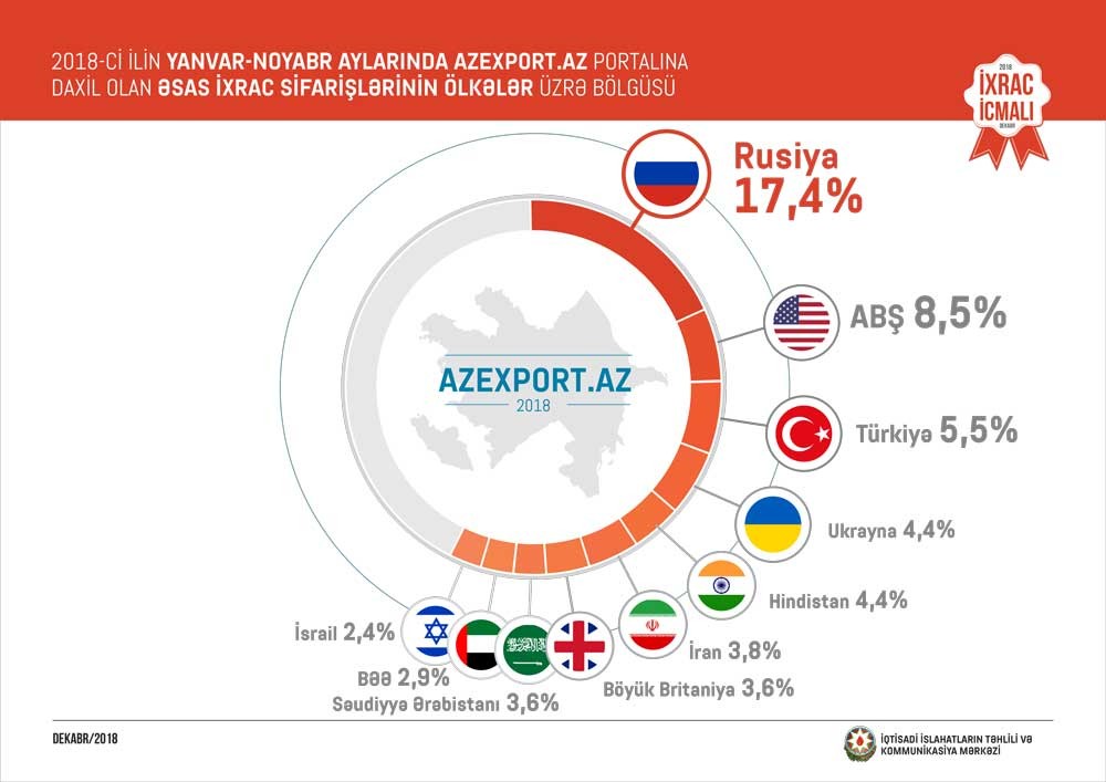 2018-ci ilin 11 ayında portala daxil olan ixrac sifarişlərinin ilk beşliyində isə Rusiya (17,4%), ABŞ (8,5%), Türkiyə (5,5%), Ukrayna (4,4%) və Hindistan (4,4%) qərarlaşıb.