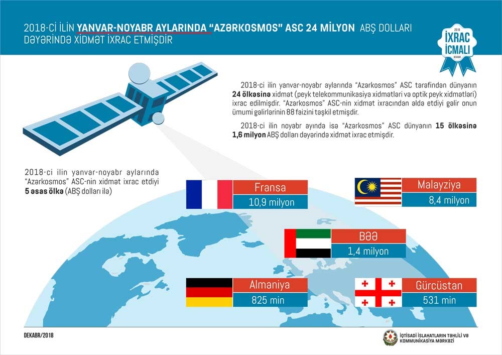 “Azərkosmos” ASC-nin xidmət ixracından əldə etdiyi gəlir onun ümumi gəlirlərinin 88 faizini təşkil edib. 2018-ci ilin noyabr ayında isə “Azərkosmos” ASC dünyanın 15 ölkəsinə 1,6 milyon ABŞ dolları dəyəri xidmət ixrac edib.