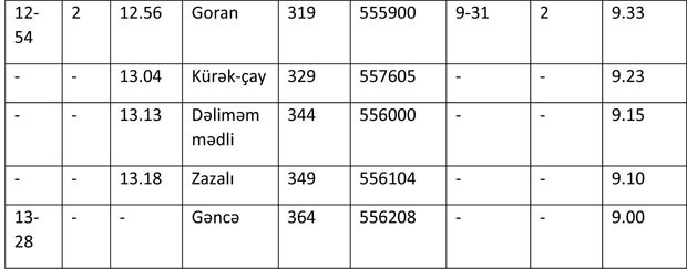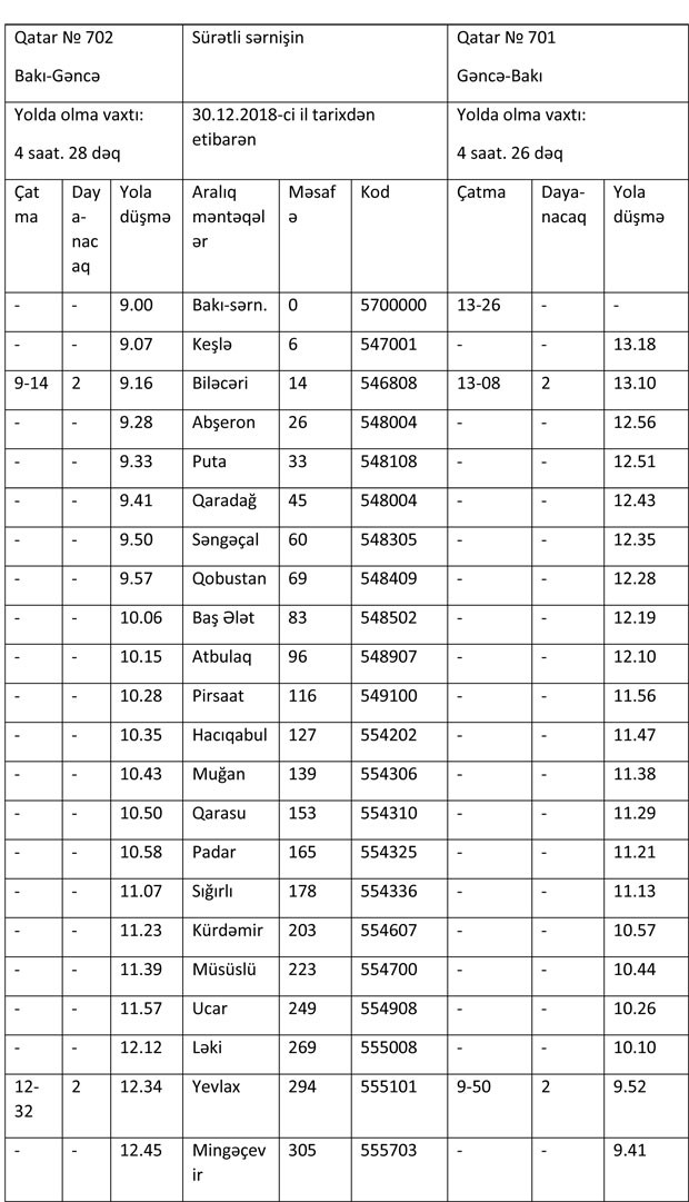 Qeyd edək ki, Bakı-Gəncə-Bakı sürət qatarı hər ayın cüt tarixlərində Bakıdan, tək tarixlərində isə Gəncə şəhərindən saat 09:00-da yola düşəcək. Qatarın yolda olma müddəti 4 saat 28 dəqiqə təşkil edir. Sərnişinlərin nəzərinə çatdırırıq ki, qatarın Biləcəri, Yevlax və Goran stansiyalarında dayanacaqları mövcuddur. 4 vaqondan ibarət qatarda Birinci class (9 yer), Biznes (62 yer) və Standart (296 yer) olmaqla, cəmi 367 oturacaq yer var. Gediş biletləri dəmiryol kassalarında və internet saytında onlayn satılır.