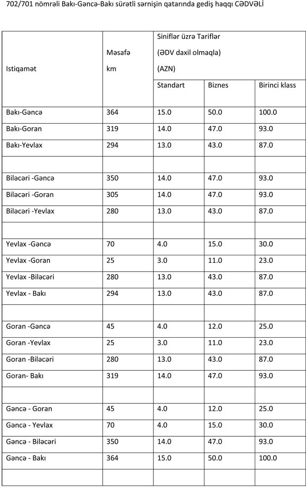Bakı-Gəncə istiqamətində gediş haqqı "Birinci class" üçün 100 manat, "Biznes" üçün 50 manat, "Standart" yerlər üçün isə 15 manatdır. Gəncə-Bakı istiqaməti üzrə də qiymətlər eyni səviyyədədir.