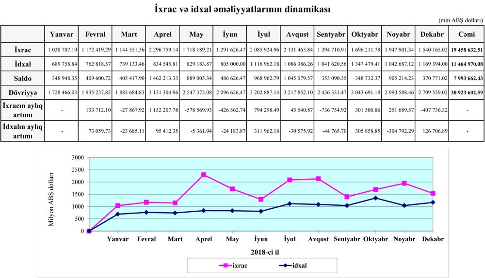 2018-ci ildə Azərbaycanın xarici ticarət əməliyyatlarının həcmi 30 milyard 923 milyon 602 min ABŞ dolları təşkil edib.