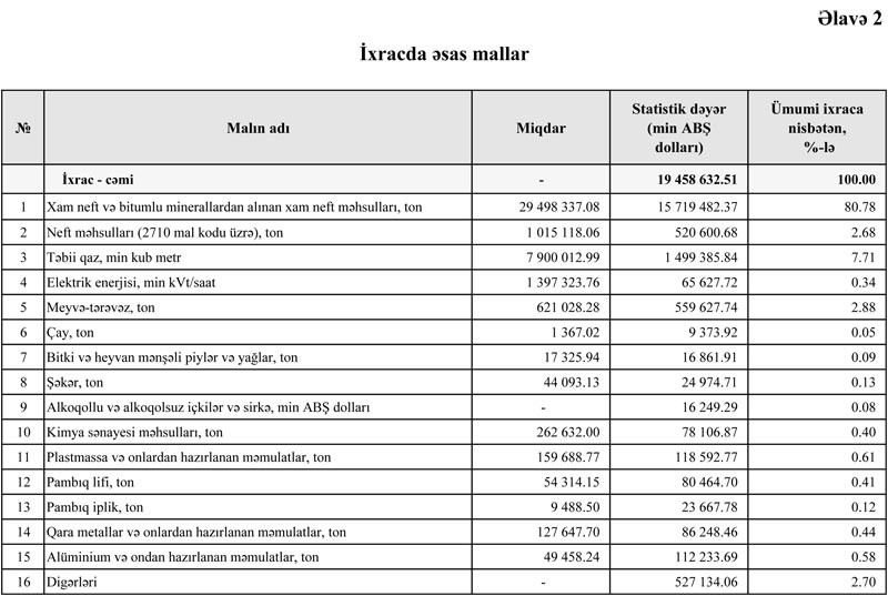 Ötən il Azərbaycanın 19 milyard 458 milyon 632 min dollarlıq ixracının 15 milyard 719 milyon 482 min dollarını (80.78%-ni) neft məhsulları, 1 milyard 499 milyon 385 min dollarını (7.71%-ni) təbii qaz və 520 milyon 600 min manatını (2.68%-ni) neft məhsulları təmin edib.