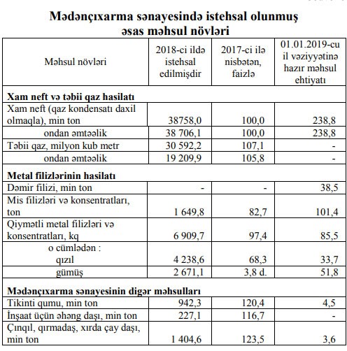 2018-ci ildə Azərbaycanda xam neftin əmtəəlik hasilatı 38,7 milyon ton, əmtəəlik təbii qazın hasilatı isə 19,2 milyard kub metr təşkil etmişdir.